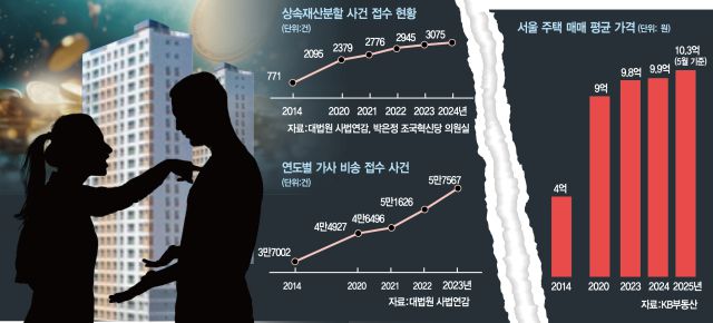 불과 10년 전인 2014년에는 연 771건에 불과했던 상속재산 분할 소송이 지난해 처음으로 3000건(2024년 기준)을 넘어섰다. 2022년 이후부터는 상속 관련 가사비송(소송 절차로 처리하지 아니하는 사건)이 해마다 5만 건 이상 접수되고 있다. 재산 분할뿐 아니라 생전 증여의 공정성 문제, 기여분 다툼, 유류분 반환청구 등 가족 간 갈등이 다양한 법적 쟁점으로 분화되고 있기 때문이다. 서울가정법원 부장판사를 지낸 김태의 법무법인 바른 변호사는 “가사재판의 특성상 실질적 분쟁 없이 협의로 끝나는 경우도 많다. 그럼에도 불구하고 정식 소송까지 가는 사건이 이처럼 늘고 있다는 것은 이제 상속이 단순한 유산이 아니라 ‘생애 자산’을 둘러싼 법적 쟁점이 됐다는 뜻”이라고 분석했다.