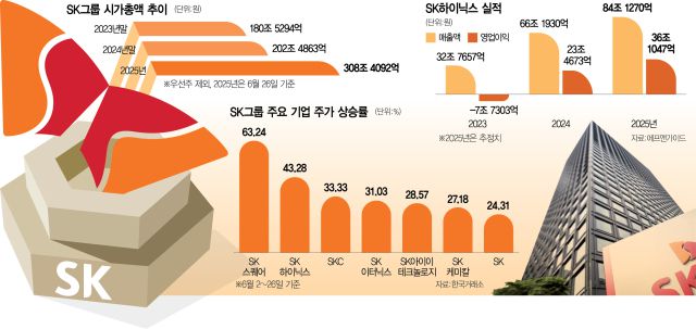 SK(034730)그룹의 시가총액이 반년 만에 100조 원 넘게 불어나며 300조 원을 돌파하는 데 성공했다. 이재명 정부 출범 이후 국내 증시가 고공 행진을 하는 가운데 인공지능(AI) 반도체 시장 불안마저 해소되자 SK하이닉스(000660)를 필두로 그룹사의 주가 급등세가 멈출 줄 모르고 있다.