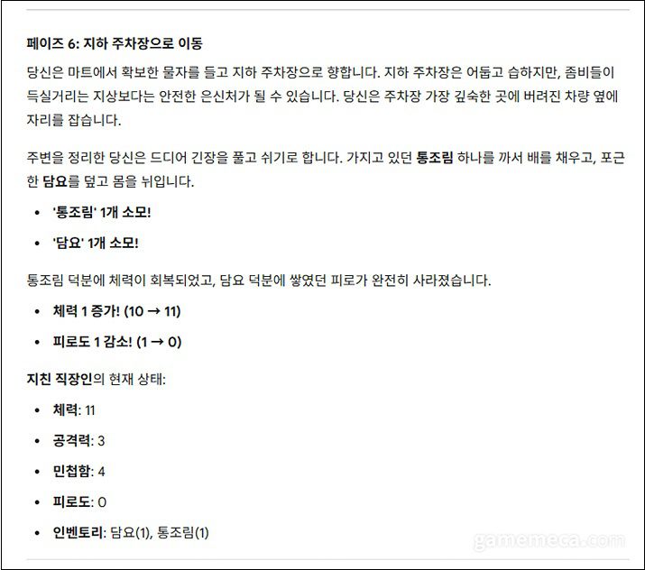 다만 상대적으로 전투나 아이템 관리 등, 우리에게 익숙한 RPG의 기본 전략을 수행하기에는 밋밋함이 있는 것도 사실이다. 이에 AI가 생성할 수 있는 다양한 상황을 만날 수 있도록 별도의 룰을 학습시키기로 했다. 이번 테스트에는 기자가 직접 만든 규칙으로, 학습이 쉽도록 최대한 스크립트를 간결하게 작성했다. 플레이어는 한 명의 생존자로서 좀비가 가득한 세상을 헤쳐나가야 하며, 본인이 가진 특성과 아이템을 활용해 생존해야 하며, 전투와 휴식을 상황에 맞게 취해야 한다.