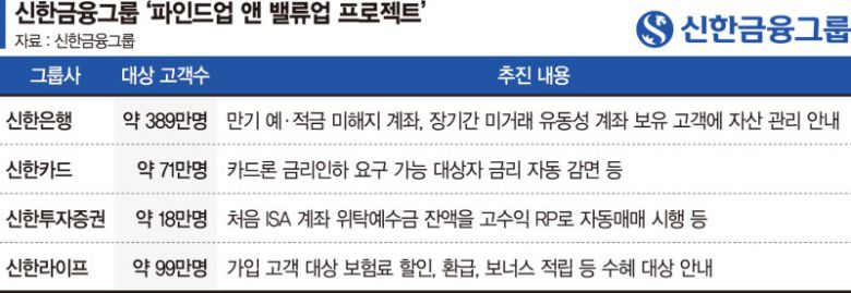 세부적으로 신한은행은 만기 예·적금 미해지 계좌(약 4만2000좌) 및 장기간 입·지급 미거래 유동성 계좌 보유고객(약 389만명)에 대한 자산관리를 안내한다. 신한카드는 카드론 금리인하 요구 가능 대상자 약 13만명에게 금리를 자동으로 내리고, 고객 약 58만명에게 소멸예정 포인트 안내 서비스를 확대할 예정이다.