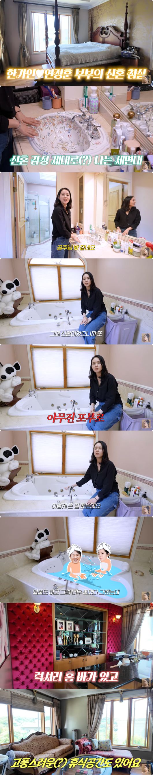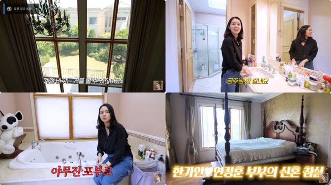 욕실을 설명하는 한가인은 “욕실에서 신경 썼던 부분이 욕조였다. 진짜 넓죠? 신혼이었으니까 둘이 같이 쓰겠다는 야무진 포부로 이렇게 큰 걸 했는데 대 실패였다”라며 물을 받는데 시간이 너무 오래 걸려서 제대로 한 번을 쓰지도 못했다고 밝혔다.