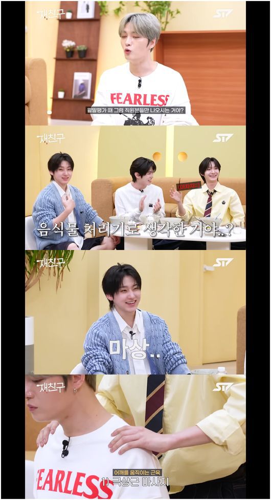 이 중 리더 계훈은 동화와 공생관계였다. 동화가 잘하는 마사지하기, 사진찍기의 혜택을 받는 만큼 동화의 입 짧은 면모를 담당하고 있다고. 계훈은 “동화가 입이 짧다. 치킨 반 마리밖에 못 먹는다”라고 말했다.