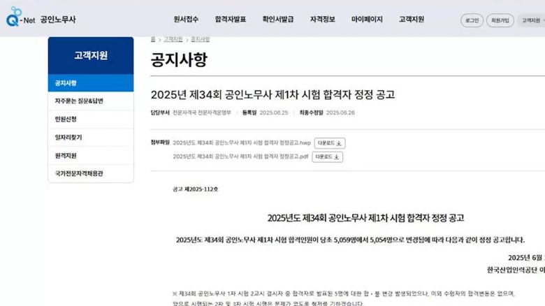 해당 시험을 시행하는 한국산업인력공단은 오늘(26일) 큐넷 공인노무사 홈페이지에 "제34회 공인노무사 제1차 시험 합격 인원이 당초 5,059명에서 5,054명으로 변경됐다"며 정정하는 공지를 올렸습니다.