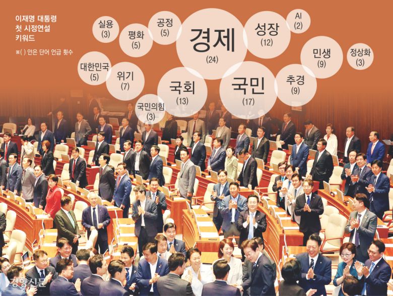 연설에서 가장 많이 언급된 단어는 ‘경제’(24번)였다. ‘국민’(17번), ‘국회’(13번), ‘성장’(12번), ‘민생’(9번), ‘위기’(7번)가 뒤를 이었다. 경제위기 상황에서 성장과 민생 회복의 중요성을 강조한 데 따른 것이다. ‘국민의힘’은 3번 등장했다. 실용은 국정운영 기조와 “실용외교”를 말한 부분 등에서 3번 나왔다.