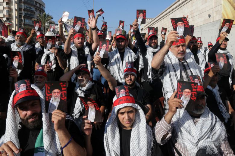 레바논에선 “이란 지지” 집회 25일(현지시간) 레바논 베이루트 주재 이란 대사관 앞에서 열린 이란 지지 집회 참석자들이 아야톨라 알리 하메네이 이란 최고지도자의 사진을 들어보이고 있다. EPA연합뉴스 |