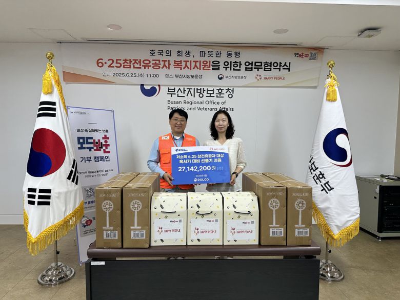 부산지방보훈청은 지난 25일 청사에서 해피피플과 업무 협약을 체결하고 건강한 여름나기를 위한 후원물품 전달식을 개최했다고 밝혔다.