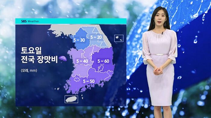 토요일 새벽에 중부지방, 오후에는 남부지방에도 비가 예상되고, 강수량이 적게는 5mm에서 많게는 대구, 경북에 최고 60mm로 지역 간의 강수량 편차가 크겠습니다.