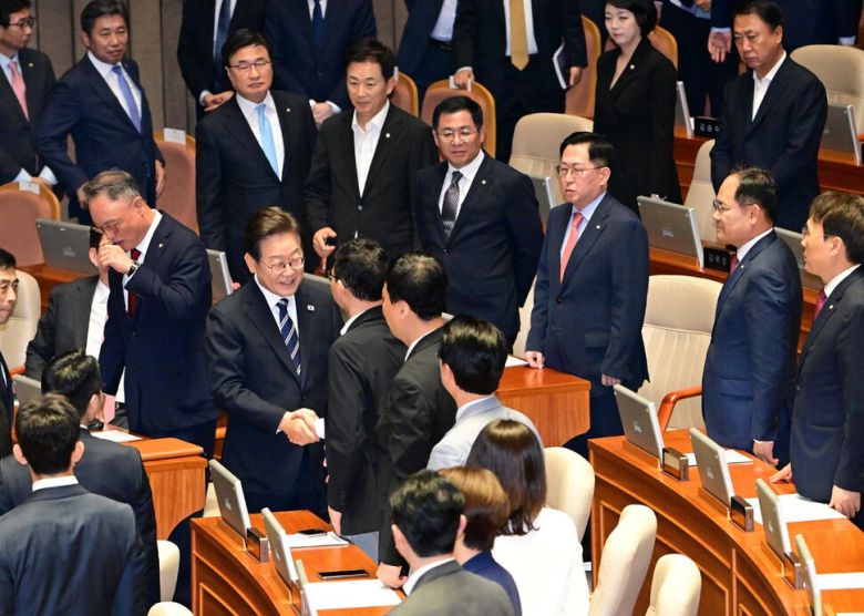 이재명 대통령이 26일 국회 본회의장에서 취임 뒤 첫 추가경정예산 시정연설을 마치고 송언석 국민의힘 원내대표와 악수를 하고 있다. 대통령실사진기자단