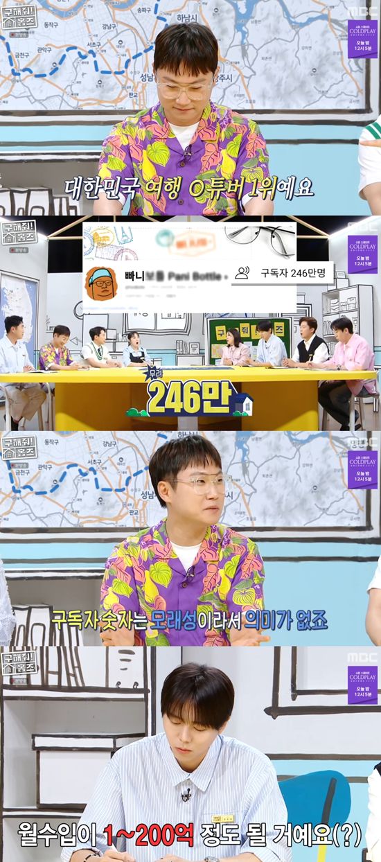 양세형이 "대한민국 여행 유튜버 1위다"라며 여행 유튜버 빠니보틀을 소개했다. 빠니보틀은 "(유튜브) 6년 차하고 있는데, 굳이 구독자 순으로 따지면 (1위가) 맞다"라고 설명했다. 양세형은 "(빠니보틀의) 구독자가 246만이다. 누적 조회수가 6억뷰다. 제가 다 조사를 했다"라고 말했다.