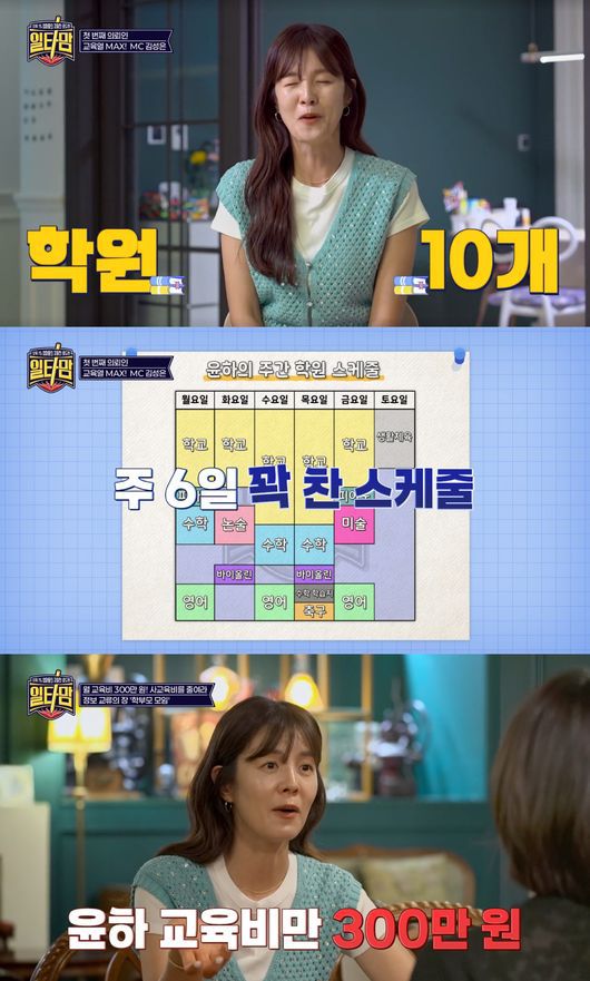 일주일간 총 다니는 학원 개수만 해도 10개가 넘는다고. 김성은은 “계산해보니까 (교육비가) 한 달에 3백만 원이 넘더라. 제가 사립초등학교를 보내고 있는데, 그게 한 달에 100만원 정도 드니까. 그래서 사교육비 200만원 더해서 총 3백만 원 정도 들어간다”고 털어놨다.