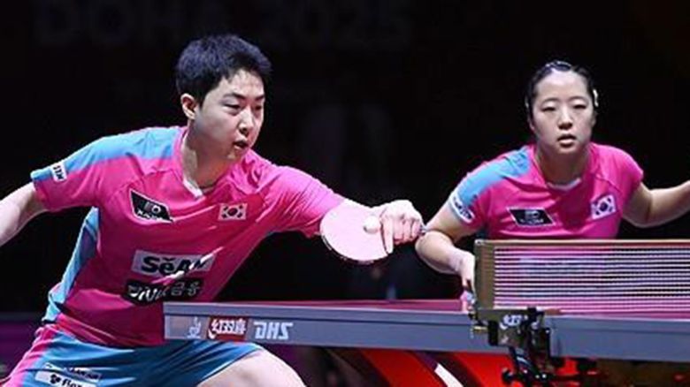 ▲ 도하 세계선수권 때 임종훈(왼쪽)과 신유빈의 경기 장면