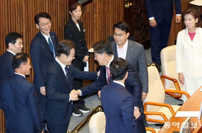 이재명 대통령이 26일 국회 본회의장에서 시정연설을 마친 후 권성동 의원을 비롯한 국민의힘 의원들과 악수하고 있다. 박형기 기자 oneshot@donga.com