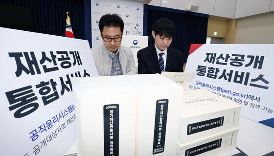 인사혁신처 관계자들이 지난 3월 26일 세종시 정부세종청사에서 ‘2025년 공직자 정기 재산변동 사항 공개목록’을 살펴보고 있다. 인사혁신처 제공 |