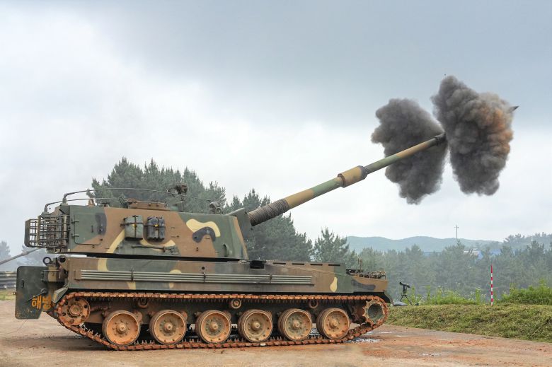 해병대 6여단 장병들이 25일 서해 해상분계선 NLL 부근에서 실시된 해상 사격훈련에서 K9 자주포 사격을 하고 있다./해병대사령부 제공