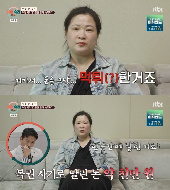 ‘이혼숙려캠프’ 팔랑귀 부부 아내가 복권 사기로 1000만 원을 잃었다고 밝혔다.