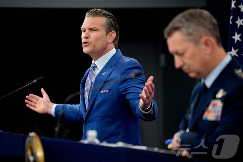 26일(현지시간) 피트 헤그세스 국방장관과 댄 케인 미국 합동참모본부의장이 버지니아주 알링턴의 펜타곤에서 열린 기자 회견에서 이란의 핵농축 시설 공격 성과에 대해 설명하고 있다. 2025.06.26 ⓒ AFP=뉴스1 ⓒ News1 류정민 특파원 |