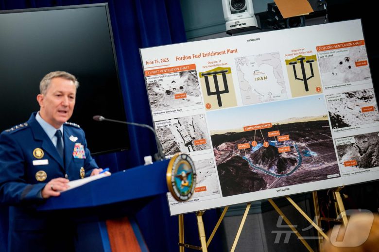 26일(현지시간) 댄 케인 미국 합동참모본부의장이 버지니아주 알링턴의 펜타곤에서 열린 기자 회견에서 이란의 포르도 핵농축 시설 공격 개요에 대해 설명하고 있다. 미군은 지난 21일 이란의 포르도, 나탄즈, 이스파한 등 3곳의 핵시설에 대한 공습을 감행했으며, 지하 90~100m 깊이에 건설된 포르도에 대해서는 이번 이란 공격에 사용된 초대형 관통 폭탄(Massive Ordnance Penetrator) GBU-57 벙커버스터 총 14발 중 12발을 집중적으로 투하했다. 케인 합참의장은 "15년간 국방위협감소국(DTRA) 요원들이 포르도 시설을 분석해 왔고, 맞춤형 무기인 GBU-57을 개발해 지질, 구조, 환기구 위치, 콘크리트 캡 두께까지 고려해 정밀 타격했다"라고 밝헜다.2025.06.26 ⓒ AFP=뉴스1 ⓒ News1 류정민 특파원"> |