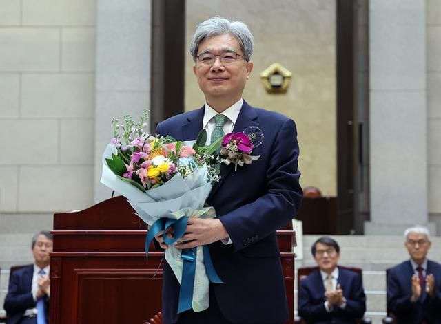 김상환 헌법재판소장 후보자가 지난해 12월 27일 서울 서초구 대법원에서 열린 퇴임식에서 꽃다발을 받은 뒤 기념 촬영을 하고 있다. 뉴스1 |