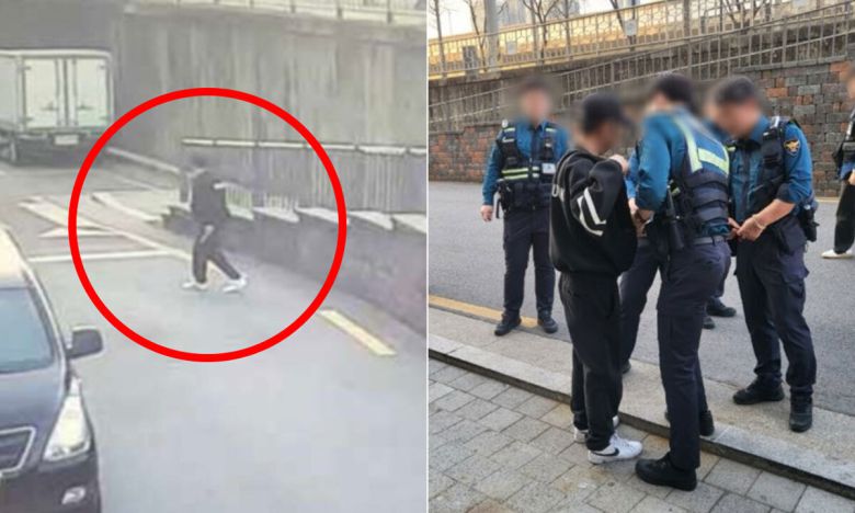 지난 4월8일 서울 성동구 청계천 산책로에서 흉기를 들고 있는 중국인 남성 A씨(왼쪽), 검거되는 A씨. 서울경찰청 제공 |