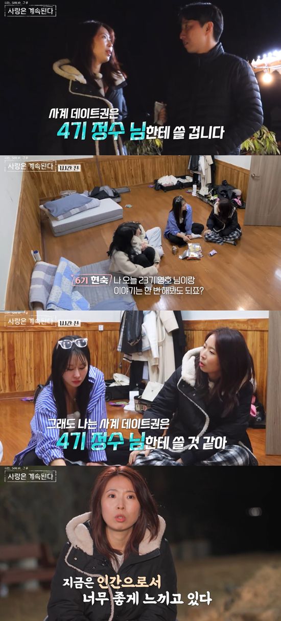 23기 영호와 이야기를 마친 6기 현숙은 4기 정수를 불러 데이트 의사를 밝혔다. 사실 1시간 전부터 6기 현숙은 23기 영호와 대화를 계획하면서도 데이트권은 4기 정수와 쓸 마음이었다. 6기 현숙은 "데이트를 통해서 이야기를 명확하게 해드리고 싶다. 지금은 인간으로서 너무 좋게 느끼고 있다는 걸 말씀드리고 싶다"라고 말했다.