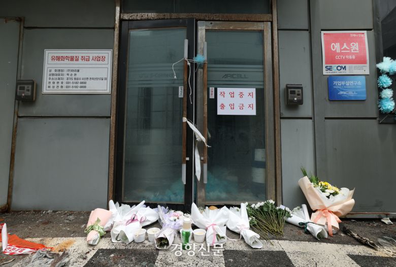24일 경기 화성시 아리셀 화재 참사 현장에 희생자들을 추모하는 물건들이 놓여 있다. 권도현 기자