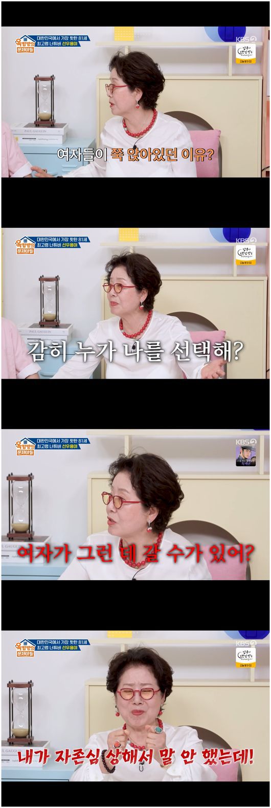 선우용여는 “있는 그대로 사는 모습을 보여드리고 싶었는데 이렇게 좋으실 줄 몰랐다”라며 겸손하게 말했다. 송은이는 “라이프 자체가 한강 보이는 한강뷰 집에 호텔 조식 먹는 영상이 엄청나게 화제가 됐다”라며 가장 핫한 영상을 언급했다.