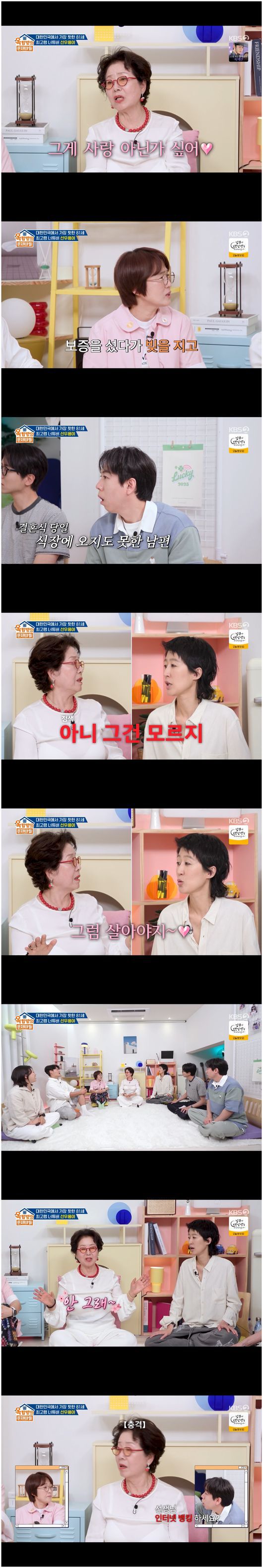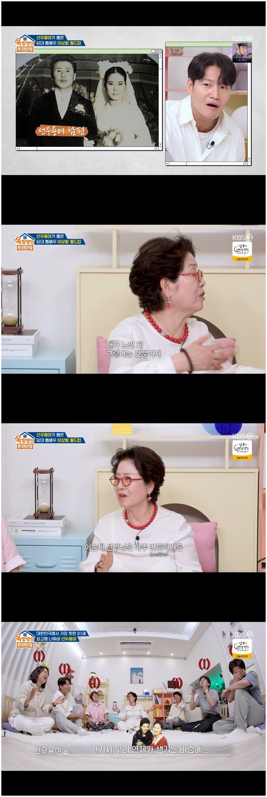 선우용여는 “난 그래도 우리 남편만큼 잘생긴 사람은 없는 거 같아”라며 영원한 남편 사랑을 뽐냈다. 이에 송은이는 “연기하기 편한 분은 누구냐”라며 비즈니스적인 질문을 건넸다. 선우용여는 “박근형이 편하다. 이순재도 잘 맞지만, 고지식한 분이다. 반듯하다. 신성일하고 이순재하고 베드신을 해야 했다”라며 핫한 화제를 꺼내 사람들을 솔깃하게 만들었다.