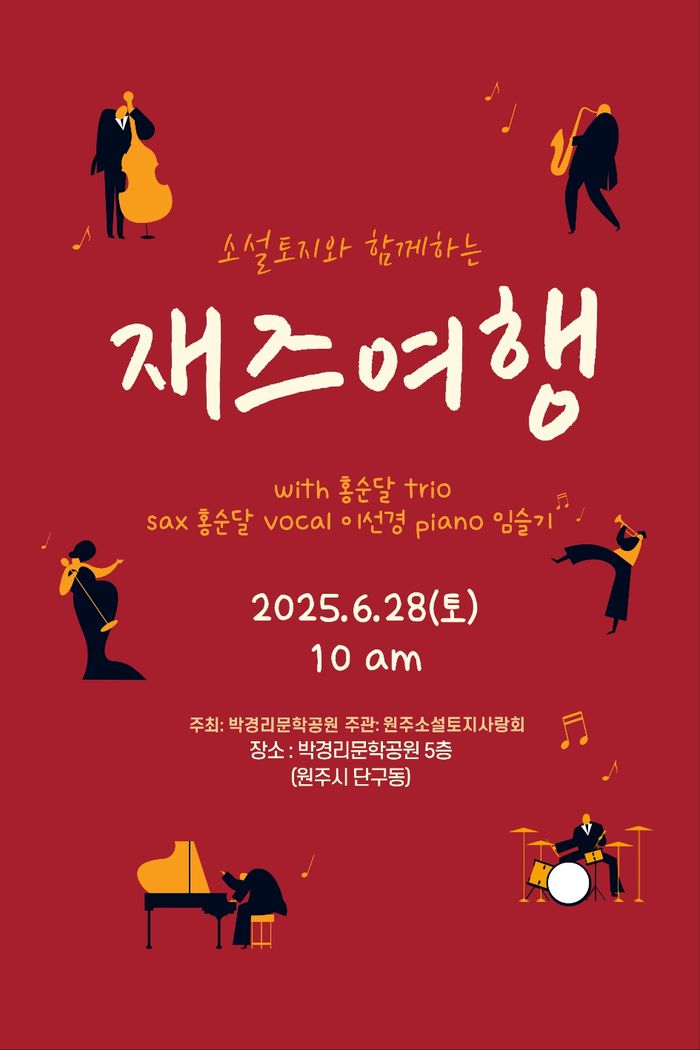 소설 토지와 함께하는 재즈여행은 원주소설토지사랑회가 운영하는 ‘2025년 원주소설토지학교’ 수업 과정의 일환이며, 박경리 작가의 소설 ‘토지’ 속 시대 배경부터 현재에 이르기까지 재즈 음악의 변천사를 선보일 예정이다. 이번 회차에 한해 탐방객을 대상으로 하는 공개수업(공연)으로 추진된다.