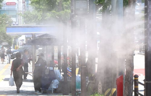 전국에 무더운 날씨가 이어졌던 지난 23일 동구 부산진역 앞 횡단보도에서 시민들이 시원한 쿨링포그(인공안개 분사시설)를 맞고 있다. /연합뉴스