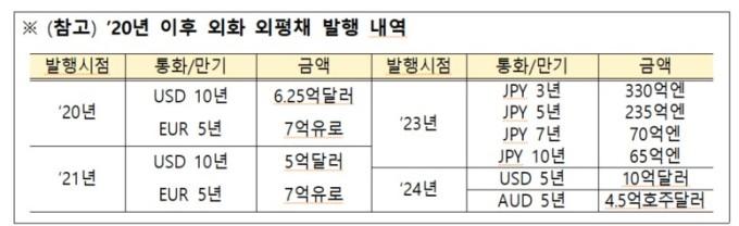 정부는 시장 상황을 주시한 후 필요한 경우 올해 하반기 중으로 외화 외평채를 추가 발행할 예정이다. 국회에서 승인받은 외화 외평채 발행한도는 총 35억 달러이며, 잔여 한도는 약 19억 달러다.