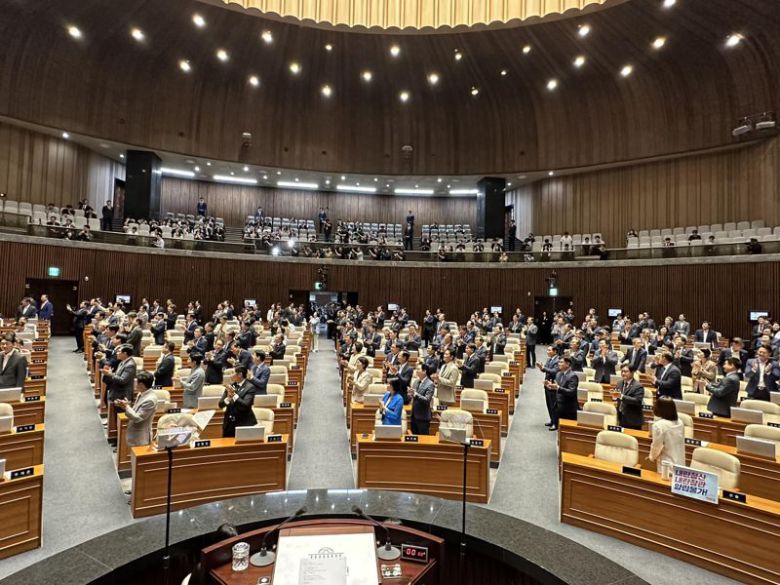 눈길을 끈 건 또 다른 사진이었다. 언론의 카메라가 이 대통령을 따라가는 사이 국회 본회의장의 시선으로 남긴 사진이었다. 사진에 이 대통령은 없고 대신 더불어민주당 의원들이 일제히 기립한 채 국민의힘 의원들 쪽을 향해 박수를 치고 있다. 의장석 위에서 지켜보다가 우 의장이 휴대전화를 꺼내 사진을 찍은 것으로 보인다.