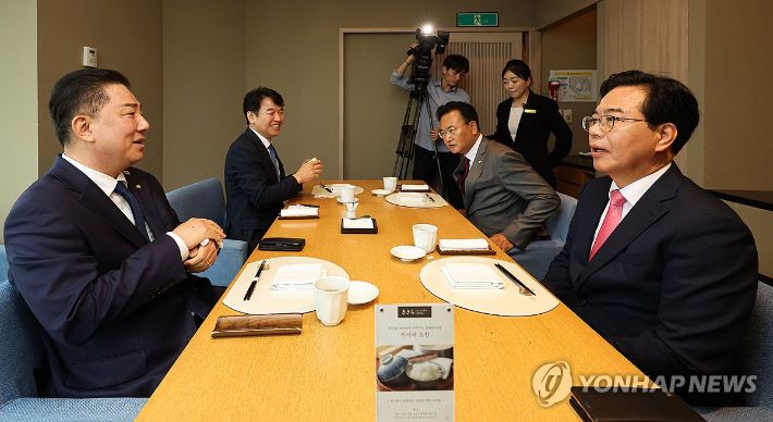◆ 문진석> 오늘 오전에 아마 야당, 어제 국회의장님 주재로 양당의 원내대표단이 이렇게 만나기로 했습니다. 그런데 야당에서 의사 전달이 안 됐다는 이유로 어제 참석을 하지 않았고요. 오늘 8시 반에 아마 야당 원내대표단이 국회의장을 만나는 것으로 알고 있습니다. 그래서 저희는 저희대로 또 이렇게 국회의장님께 요청을 다시 한번 드릴 예정이고요.