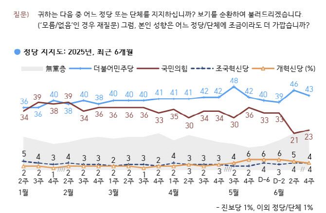 민주 43% 국힘 23% 지지율…개혁신당 4%[한국갤럽]