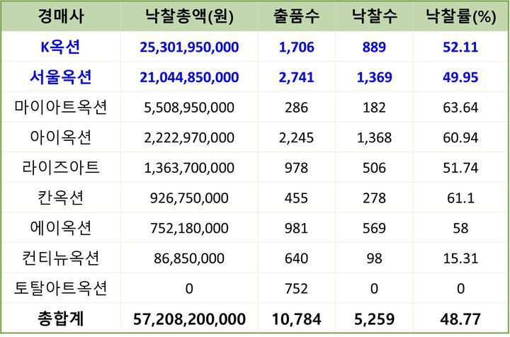 경매사별로는 K옥션이 약 253억 원으로, 210억 원을 기록한 서울옥션을 앞질러 거래액 1위를 차지했다. 낙찰률에서는 마이아트옥션이 63.6%로 가장 높았고, K옥션은 52.1%, 서울옥션은 49.9%를 기록했다.