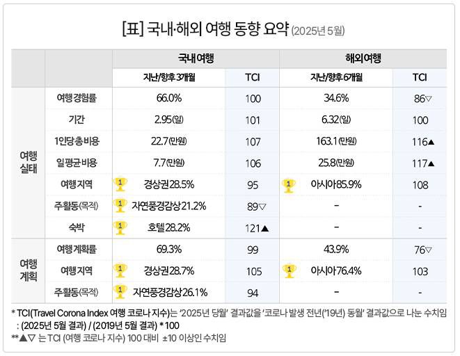 한편, 해외여행은 여전히 회복 속도가 더딘 모습을 보인다. 5월 해외여행 경험률은 TCI 지표 기준 86으로, 2019년 동기 대비 14포인트 낮았고, 계획률(76)도 같은 기준에서 24포인트 낮았다. 이는 전반적인 해외여행 수요가 아직 팬데믹 이전 수준에 도달하지 못했음을 보여준다.