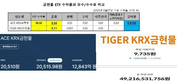 미래에셋 금현물ETF의 보수는 연 0.15%로, 'ACE 금현물ETF'의 총보수(연 0.5%)의 5분의 1 수준에 불과하다. 미래에셋이 선택한 총보수(0.15%)에서 가장 큰 비중을 차지하는 운용보수(연 0.11%)는 한투운용의 4분의 1 수준이다. 미래에셋운용의 테마형/액티브형/채권형 ETF의 운용보수와 유사한 수준으로 추산된다.