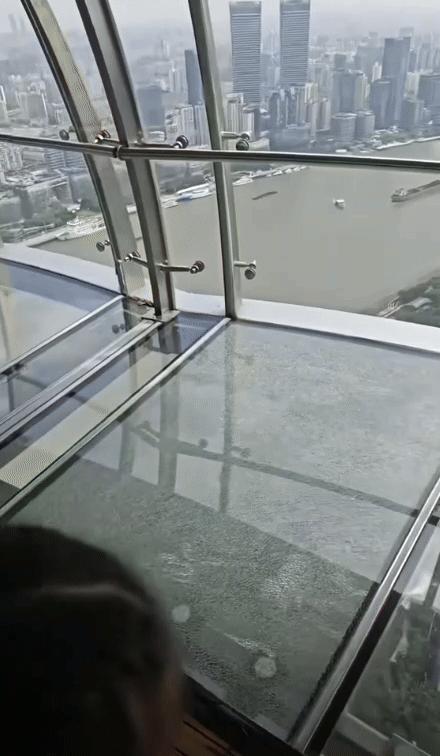 해당 영상에는 도시 전경이 내려다보이는 유리 전망대의 바닥 유리 한 면에 촘촘한 균열이 생긴 모습이 담겼다.