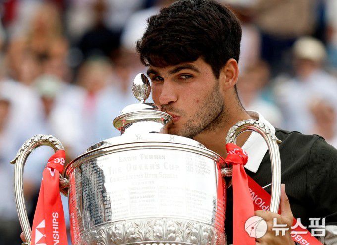 [런던 로이터=뉴스핌] 박상욱 기자= 알카라스가 22일 ATP 투어 HSBC 챔피언십 우승 트로피에 입을 맞추고 있다. 2025.06.22 psoq1337@newspim.com |
