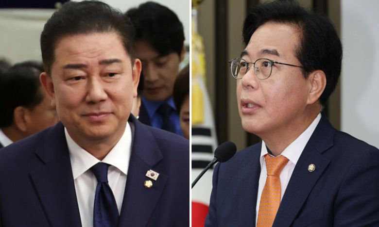 민주당 김병기 당대표 직무대행 겸 원내대표, 국민의힘 송언석 원내대표(왼쪽부터). 연합·뉴시스 |