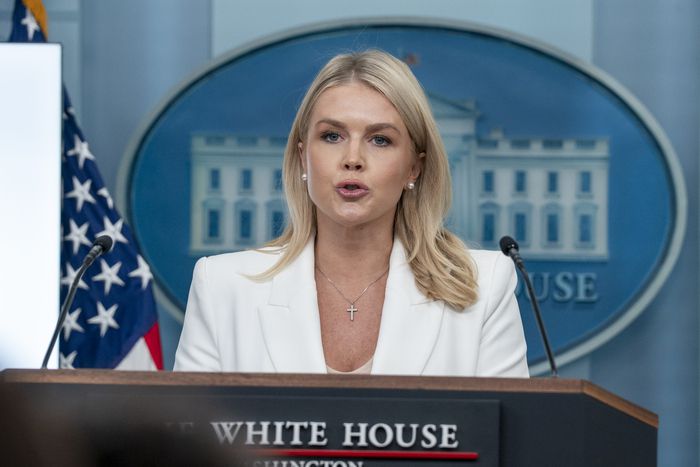 캐롤라인 레빗 백악관 대변인이 26일(현지시간) 백악관 브리핑에서 기자 질문에 답하고 있다. [UPI 연합]