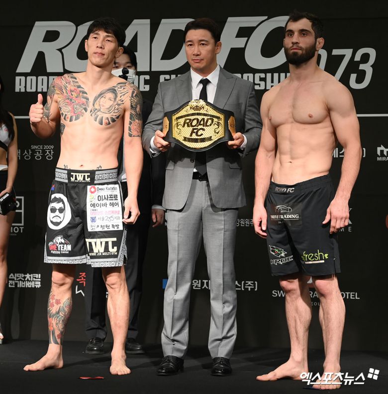 (엑스포츠뉴스 고아라 기자) 27일 오후 서울 서대문구 스위스그랜드호텔 컨벤션센터에서 열린 ‘굽네 ROAD FC 073’ 공식 계체량에서 오카, 카밀 마고메도프가 계체량을 통과한 뒤 포즈를 취하고 있다.고아라 기자 iknow@xportsnews.com이 기사의 카테고리는 언론사의 분류를 따릅니다.0공유하기