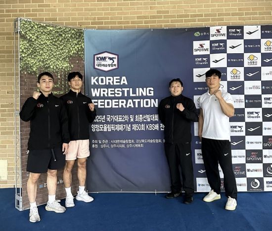 구로구청 레슬링팀이 2025년 국가대표 2차 및 최종 선발대회 종료 후 포즈를 취하고 있다. (좌측부터 최민우, 최미르, 정용석 강대규 선수). 구로구 제공. |