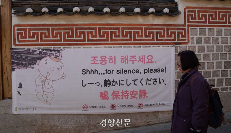서울 종로구 북촌의 한 벽면에 조용히 해달라는 현수막이 붙어있다. 김창길 기자