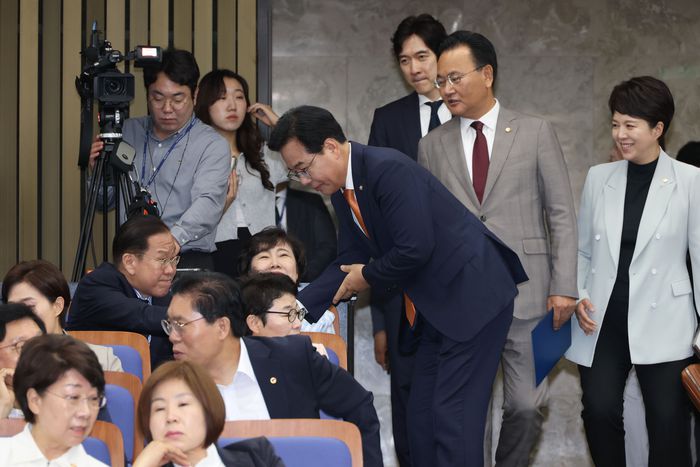 송언석 국민의힘 원내대표가 27일 오전 서울 여의도 국회에서 열린 의원총회에 참석하며 권영세 전 비상대책위원장과 인사하고 있다. <뉴스1>