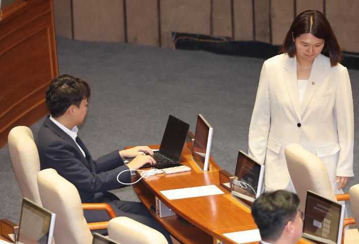 진보당 손솔 의원이 27일 국회 본회의에서 인사말을 마친뒤 자리로 향하고 있다. 왼쪽은 개혁신당 이준석 의원. 연합뉴스 |