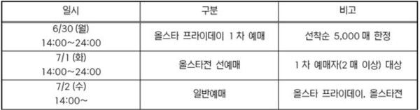 30일 오후 2시부터 당일 자정까지는 7월 11일 열리는 올스타 프라이데이 입장권에 대한 선예매(5,000매)가 실시된다. 올스타 프라이데이는 퓨처스 올스타전을 비롯해 KBO 리그 올스타 선수들이 펼치는 홈런레이스 등 다채로운 프로그램으로 구성되어 있다.