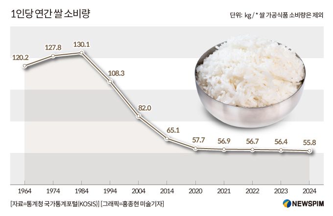지난해 국민 1인당 쌀 소비량은 56.4kg로 관련 통계가 시작된 1962년 이후 가장 낮았다. 30년 전인 1994년(120.5kg)과 비교해도 53.2%나 줄어드는 수치다.