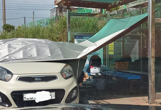 사진 속 여성은 정류장 앞에 역주행 방향으로 차를 세운 뒤 그늘막을 설치했다. 차량 앞유리를 덮은 천막을 정류장 기둥에 고정하는 방식이었다. 그 밑에는 해루질 장비가 플라스틱 바구니 등과 함께 놓여 있었다. 제보자 A씨는 "여긴 해수욕장인데 사람들이 며칠 머물면서 해루질을 많이 한다"며 "그런데 60대로 보이는 아주머니가 저렇게 해놓고 토치까지 사용해 뭘 구워먹고 있다"고 지적했다.