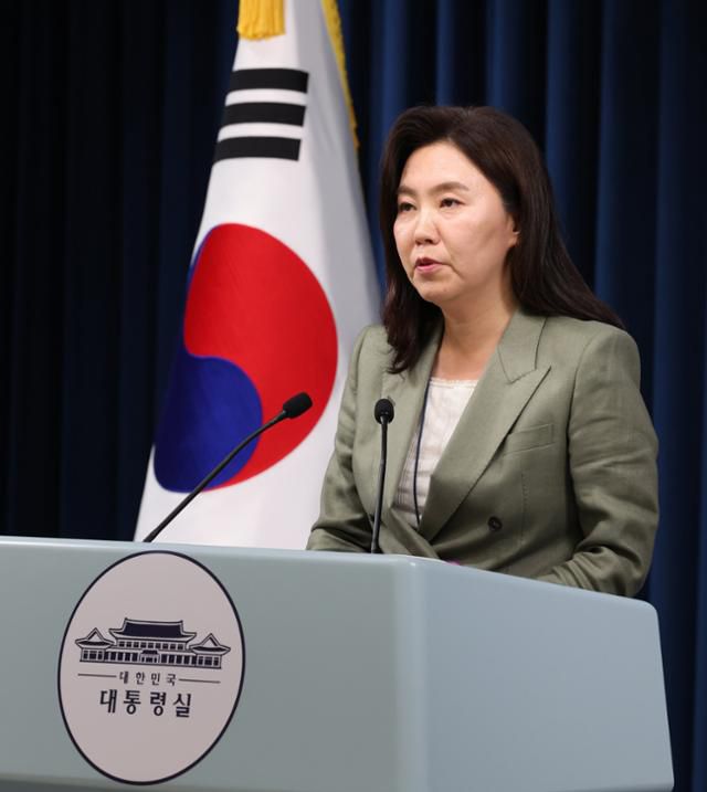 강유정 대통령실 대변인이 27일 서울 용산 대통령실 브리핑룸에서 호국보훈의 달 행사 관련 브리핑을 하고 있다. 왕태석 선임기자 |