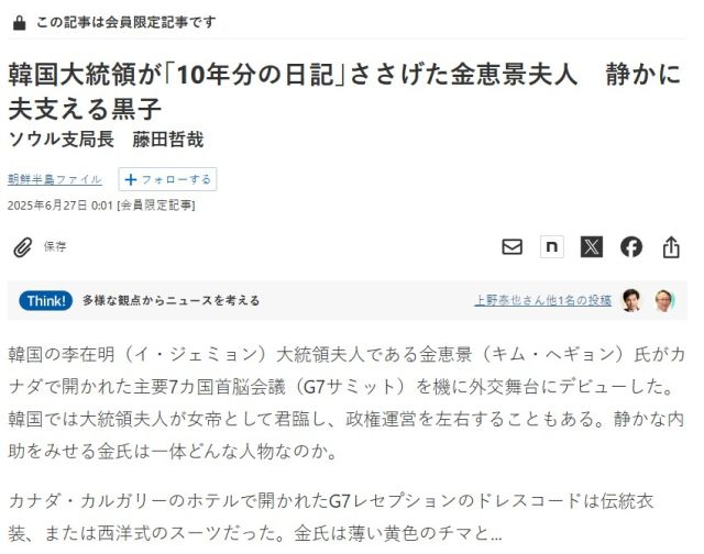 일본 니혼게이자이신문(닛케이)은 27일 "이재명 대통령의 부인 김혜경 여사가 캐나다에서 열린 G7 정상회의를 계기로 외교 무대에 데뷔했다"고 서울지국장 후지타 테츠야의 기사를 보도했다. 해당 기사는 유료 기사로, 닛케이를 구독한 회원들만 볼 수 있다.